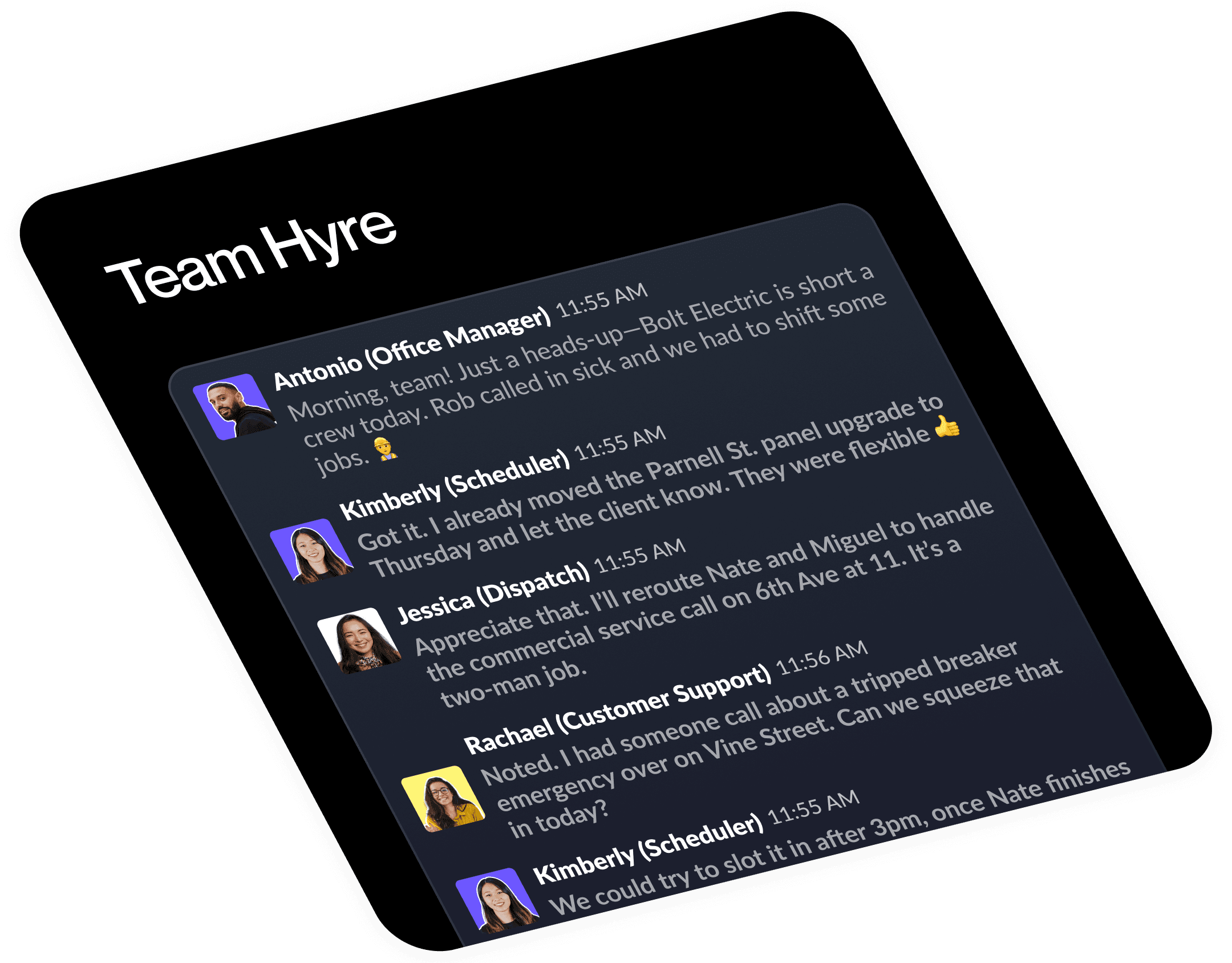Hyre helps solar companies streamline appointment scheduling, manage inbound leads, coordinate site assessments, follow up on proposals, and stay on top of paperwork — without sacrificing quality or control.